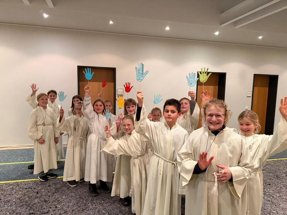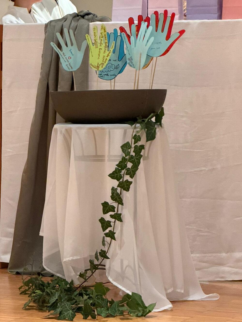 Der Gottesdienst stand unter dem Thema: „Helfende Hände“. Dazu haben wir uns beim Ministrantennachmittag vorbereitet, es wurden Hände gebastelt mit Gründen, warum sie MinistrantIn sein möchten, wie z.B.