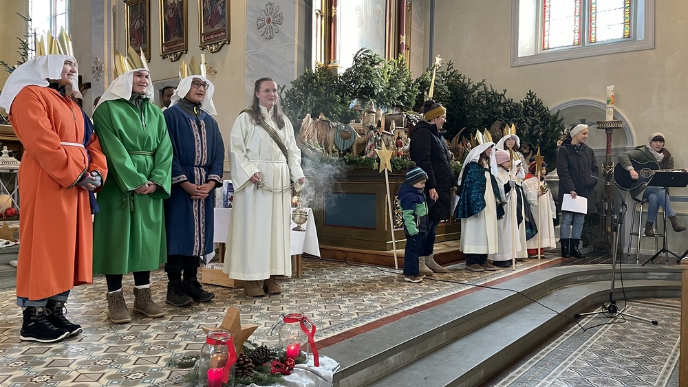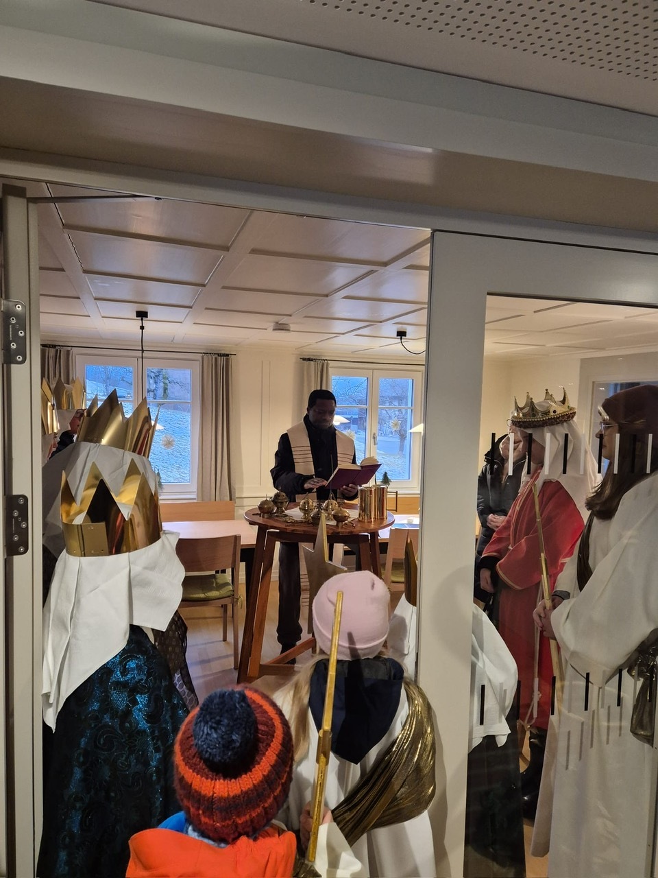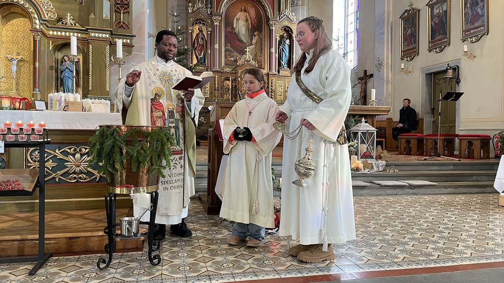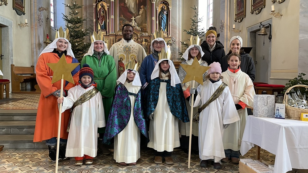 Bevor die Sternsinger am Morgen starteten, feierte Pater Regis eine Aussendungsfeier. Dabei segnete er die Sternsingergaben sowie alle Sternsingerinnen und Sternsinger.