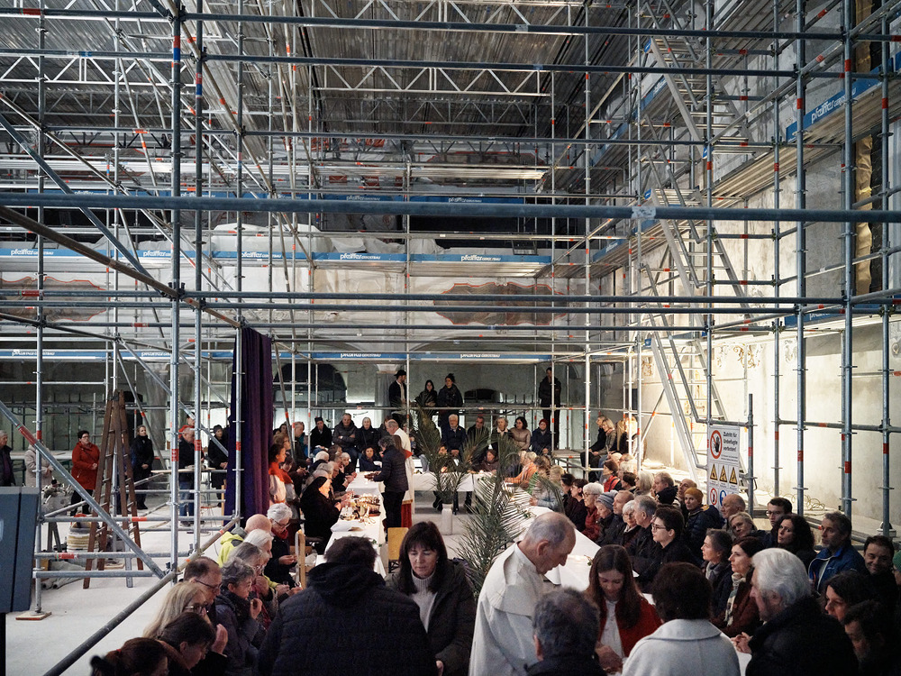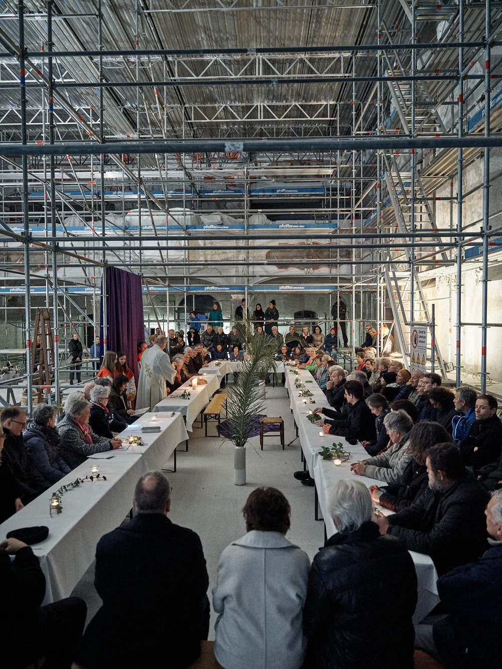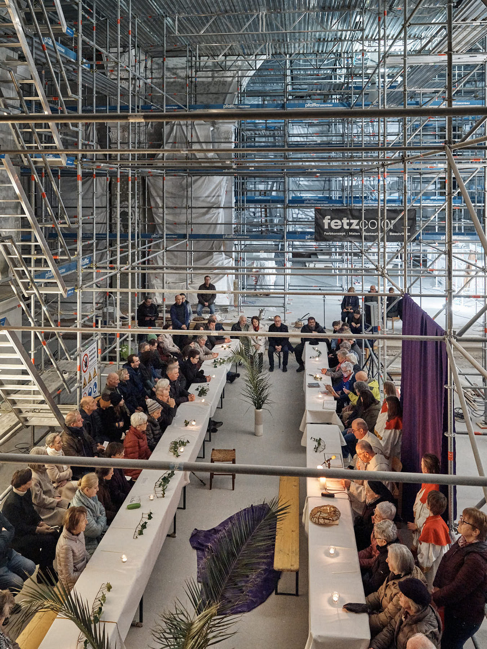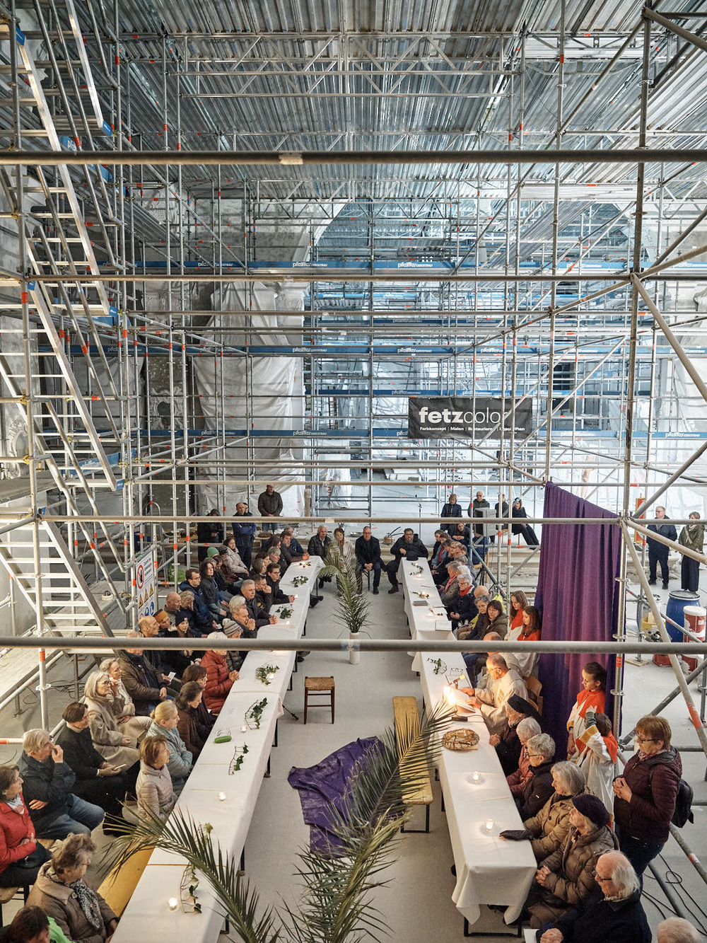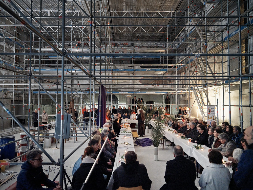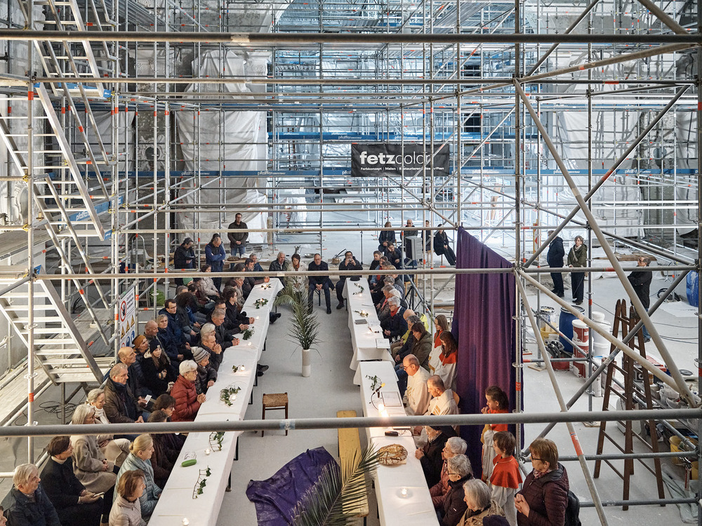 Also wurde am Gründonnerstag kurzerhand eine große Tafel zwischen den Gerüsten aufgebaut. Die Menschen kamen und es wurde Gottesdienst gefeiert. Eine wirklich gelungene Hinführung auf Ostern!