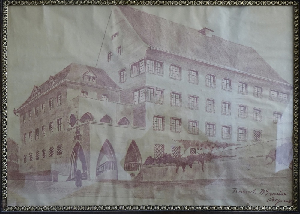 1956 abgebrochen, 4 geschossiger Trakt mit steilem Sattelach, Eck-Loggia, Kapellentrakt mit Satteldach 1956