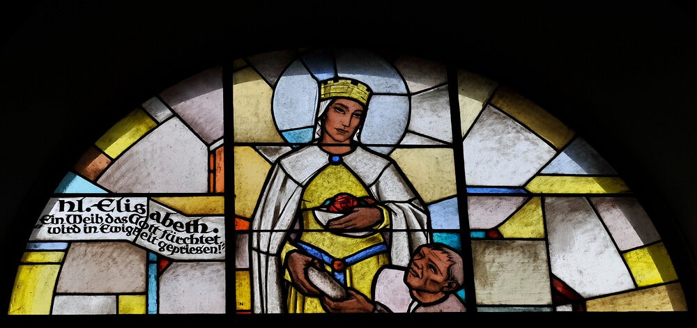Wolfurt,Pfarrkirche Hl. Nikolaus, hl. Elisabeth „ Ein Weib das Gott fürchtet wird in Ewigkeit gepriesen!“, 1938 Entwurf Ernst Nepo Tirol, Ausführung Tiroler Glasmalerei Innsbruck