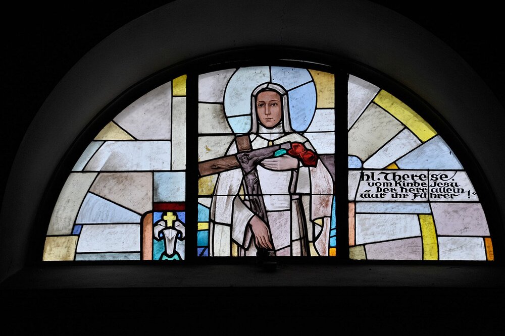 Wolfurt,Pfarrkirche Hl. Nikolaus, hl. Therese vom Kinde Jesu “Der Herr allein war ihr Führer” 1938 Entwurf Ernst Nepo Tirol, Ausführung Tiroler Glasmalerei Innsbruck