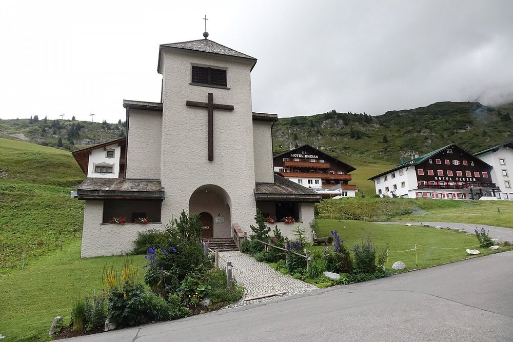 Dieses Kleinod der Moderne des Kirchenbaues in Vorarlberg mit den frühesten Glasfenstern von Martin Häusle liegt versteckt hinter den Hotels im Nobelskiort Zürs. Es ist mehr als wert entdeckt zu werden im Sommer bei einer Wanderung oder im Winter als willkommene Erholung vor dem Rummel des Apres Ski Getöse.